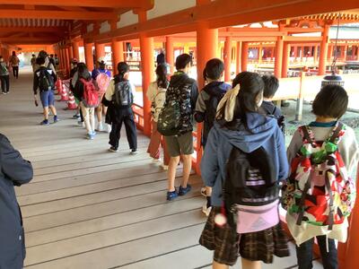 今日の天気は、曇り。朝食を食べた後、退館式を行い、この後、宮島に向かいます。