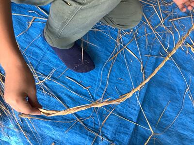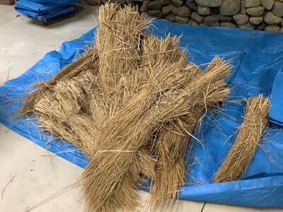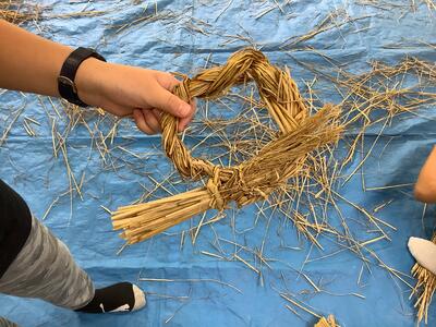 ただ残念なことに、昨日の雨で田圃がぐちゃぐちゃになっており、予定されていた稲刈りは実施不可能になり、今日の一つ目のプログラムは、わら細工づくりをおこなうことになりました。思った以上に難しかったようです。