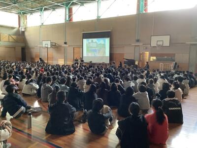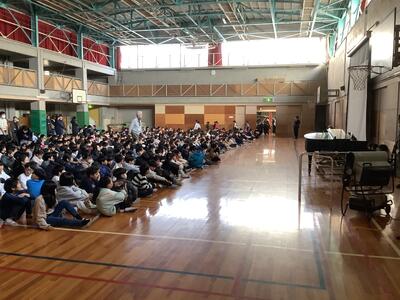 集会では、6年生が修学旅行の平和学習で学んだことについての発表を聴き、その後特別